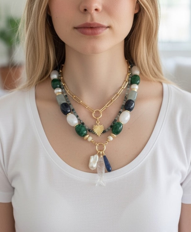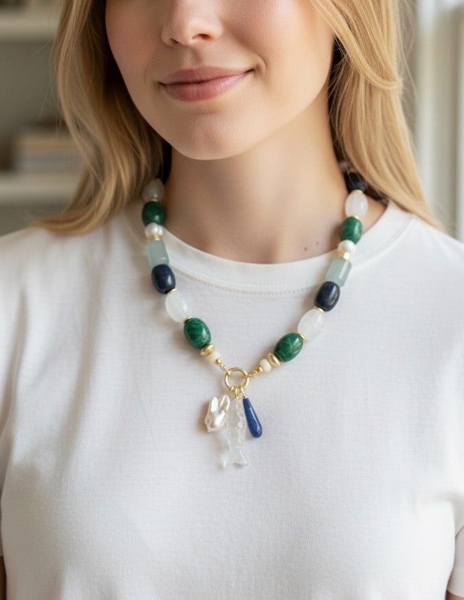 Inspired by the calm and depth of the sea, the Deep Water Necklace features rich navy and emerald stones paired with luminous white accents for a crisp, coastal contrast. A carved fish pendant, freshwater pearl, and deep blue drop charm bring movement and meaning to the design.
